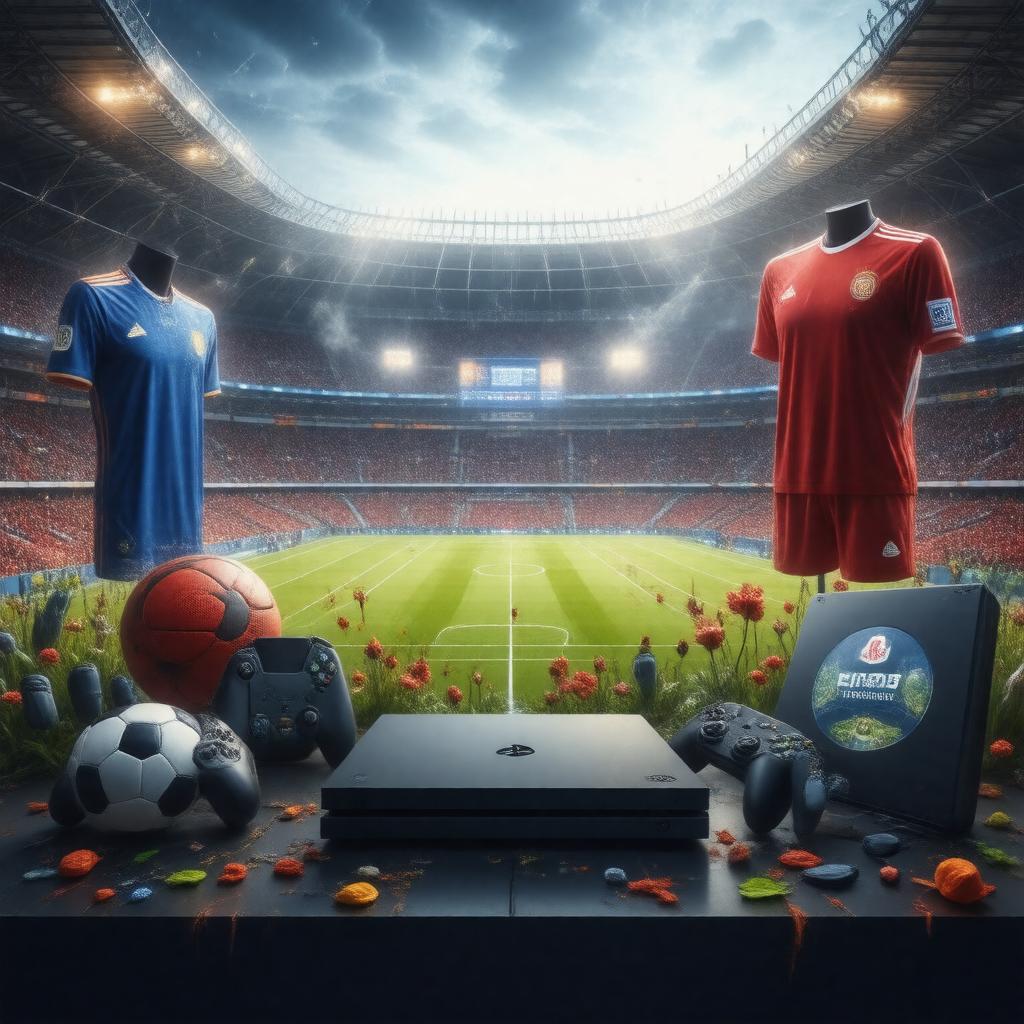 "Create an image of a FIFA video game series logo with a dynamic background of a soccer stadium, featuring a PlayStation, Xbox, and PC console in the foreground, surrounded by soccer balls, jerseys, and other gaming accessories, with a subtle Frostbite Engine watermark, symbolizing the series' evolution and success since its first release in 1993, with a hint of excitement and energy, reflecting the series' popularity and realism."