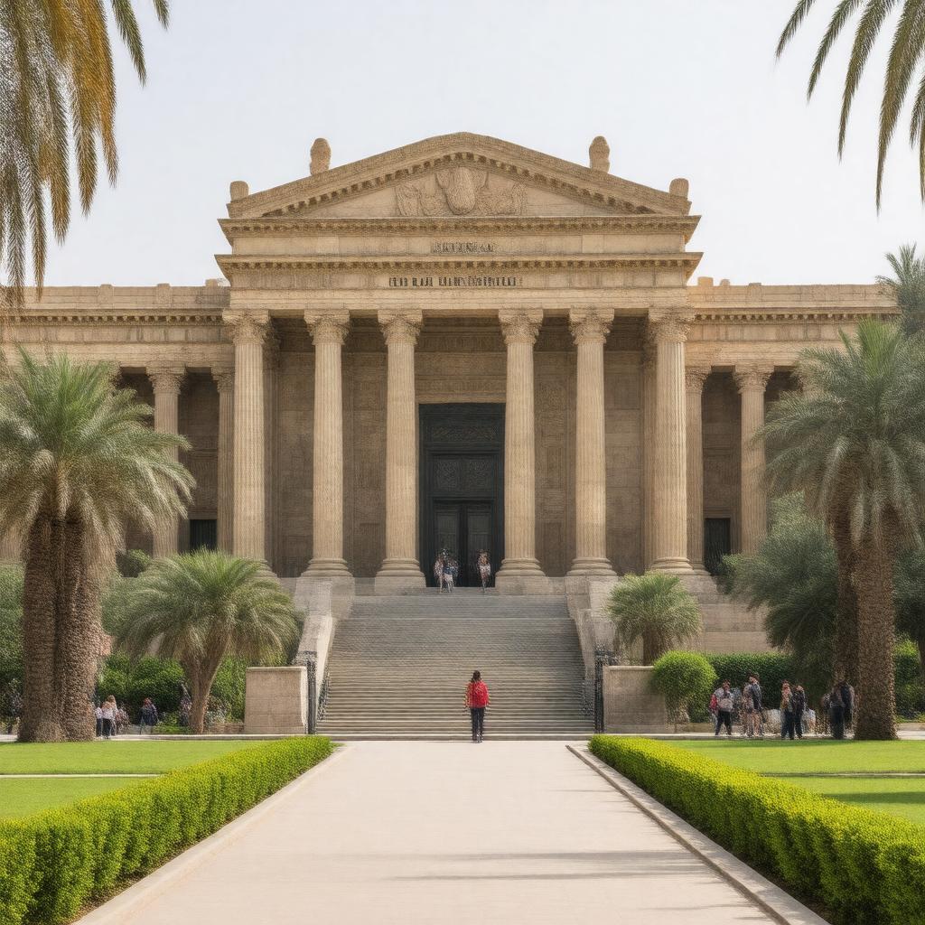 Generate an image of a grand, neoclassical building with a mix of modern and ancient Egyptian architectural elements, situated on a sprawling campus in Giza, Egypt. The building features a large stone façade with columns, and a prominent entrance with a stone pediment. In the foreground, there are lush green spaces and a few students walking around. The building sign reads "Faculty of Archaeology, Cairo University". The style should be a realistic depiction of a university building, with a warm and sunny atmosphere, reflecting the rich history and culture of Egypt. The image should convey a sense of academic excellence and archaeological significance.