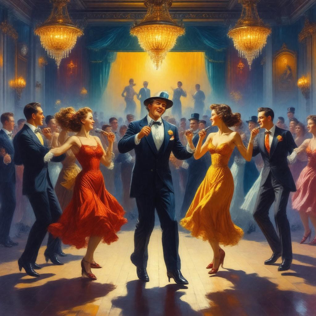 Create an image of a vibrant, dynamic scene capturing the essence of the song "Fascinating Rhythm". The scene is set in a 1920s-style ballroom with a live jazz band performing on stage. The musicians are dressed in attire typical of the era, with the lead singer holding a microphone and dancing with a flapper. In the background, couples are dancing the Charleston and other popular dances of the time. The atmosphere is lively and energetic, with bright colors and bold patterns. Incorporate iconic symbols of the jazz age, such as art deco designs, vintage posters, and sparkling chandeliers. The overall mood should convey the infectious energy and carefree spirit of the song, which has become a jazz standard covered by many famous artists over the years.