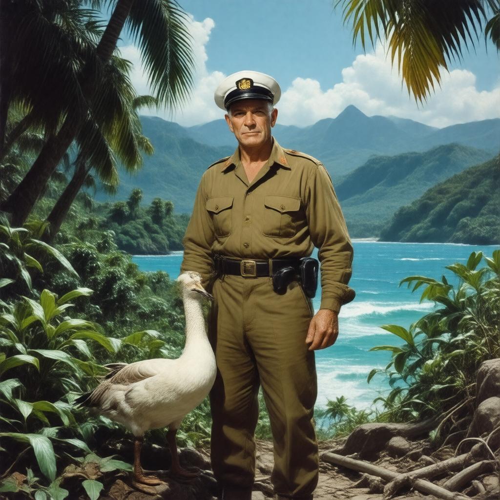 "Generate an image of a 1940s Pacific island, with a rugged coastline and dense jungle, featuring a older man in a worn naval uniform, resembling Cary Grant, standing heroically with a goose by his side, amidst war equipment and tropical foliage, in a style reminiscent of classic Hollywood films, with warm and vibrant colors, capturing the essence of a romantic comedy set during World War II."