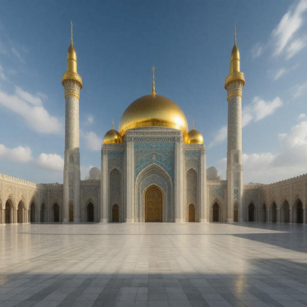 "Generate an image of a grand, golden-domed shrine with four minarets, surrounded by courtyards and a mosque, in the style of Islamic architecture, located in Qom, Iran, and representing the Fatima Masumeh Shrine, a major Shia pilgrimage site and significant religious landmark, with a realistic and detailed depiction of its beautiful architecture and surroundings."