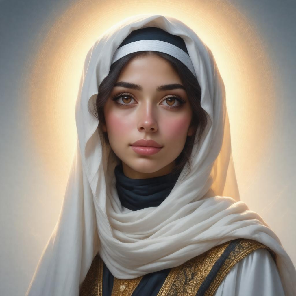 Generate an image of Fatimah bint Muhammad, a revered figure in Islam, depicted as a serene and dignified woman from the 7th century, dressed in traditional Arabic attire, surrounded by a subtle aura, symbolizing her spiritual significance, with a gentle expression, conveying compassion and wisdom, in a realistic and respectful style.