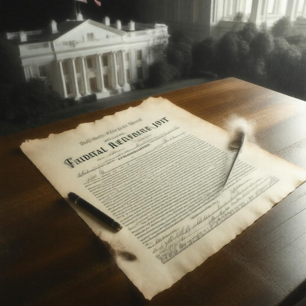 "Create an image of a historic document, specifically the Federal Reserve Act of 1913, with a formal and official tone. The document should be displayed on a wooden desk or table, with a pen or quill lying next to it. In the background, a subtle image of the White House or a federal building should be visible. The document should be illuminated by a soft, warm light, conveying a sense of importance and significance. The style should be reminiscent of traditional American art, with muted colors and classic typography. The image should evoke a sense of history, stability, and financial regulation."