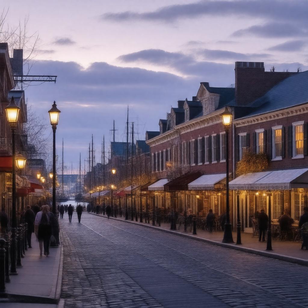 "Generate an image of a charming, historic waterfront neighborhood at dusk, with cobblestone streets, old-fashioned street lamps, and a mix of Federal, Victorian, and Greek Revival-style buildings. The scene should feature a bustling nightlife with people walking along the street, and bars and restaurants in the background. In the distance, a bay or harbor with boats and a few ships can be seen. Include some historic landmarks like the Admiral Fell Inn and Broadway Market. The image should capture the vibrant, diverse atmosphere of Fells Point, a neighborhood in Baltimore, Maryland, with a rich maritime history."
