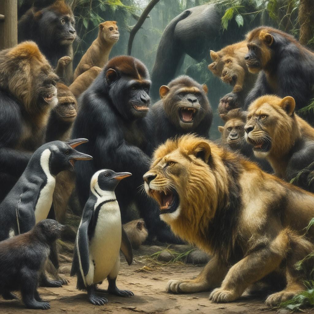 "Generate an image of a chaotic and comedic scene at a London zoo, featuring a variety of wild and exotic animals, including penguins, monkeys, and lions, with some of the animals escaping from their enclosures and interacting with the zookeepers, in a style reminiscent of a 1990s comedy film, with a muted color palette and a sense of energy and movement, representing the 1997 film 'Fierce Creatures'."