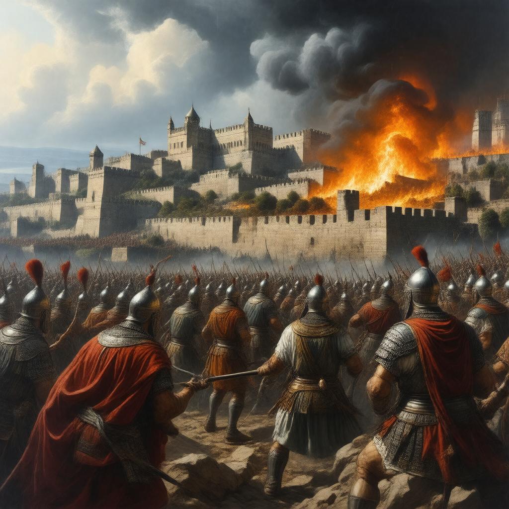"Generate an image of a dramatic and intense battle scene depicting the Siege of Jerusalem during the First Jewish–Roman War, also known as the Great Revolt, in 70 CE. Show Roman legionnaires breaching the walls of Jerusalem, with the Second Temple in flames in the background. Incorporate Jewish rebels defending their city, with a chaotic and apocalyptic atmosphere. The style should be reminiscent of ancient Roman art, with detailed armor, architecture, and intense emotions. The scene should convey the significance and devastation of this pivotal event in Jewish history."