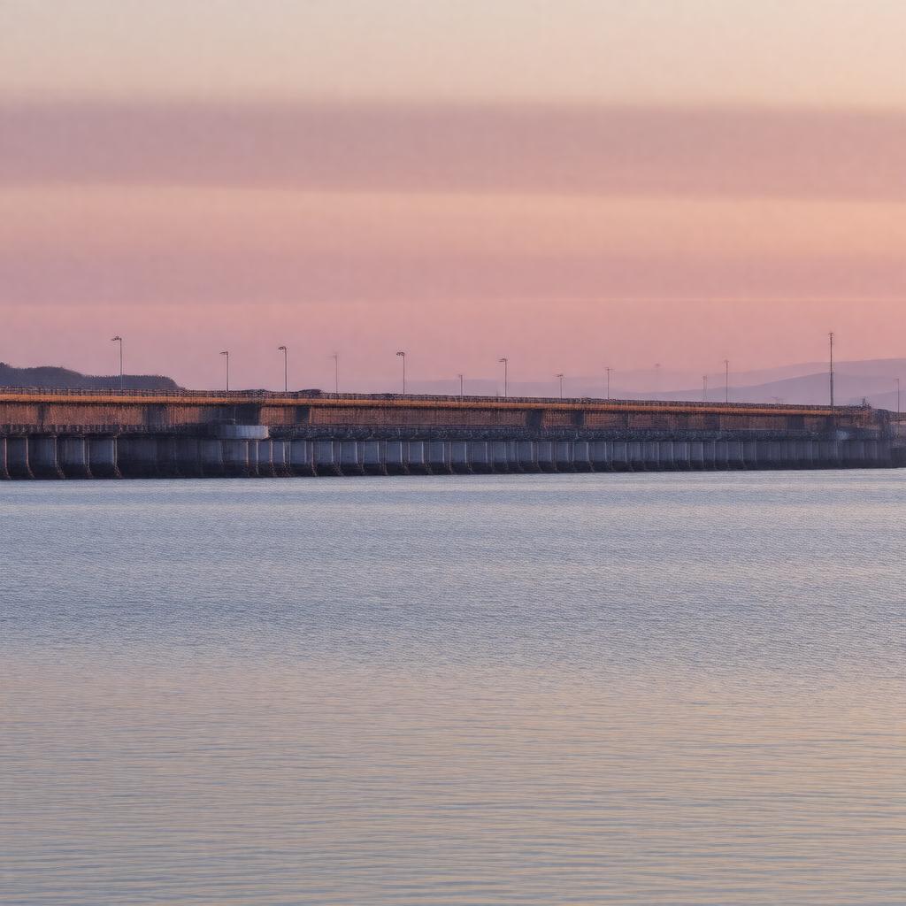 "Generate an image of a serene firth at sunset, with the Tay Road Bridge and Tay Rail Bridge spanning across it, surrounded by the scenic landscape of Scotland, with the North Sea in the background, and featuring wildlife such as seals, dolphins, and seabirds; in a realistic style, highlighting the natural beauty of the Firth of Tay, located near Dundee, Newport-on-Tay, Tayport, Broughty Ferry, and Wormit."