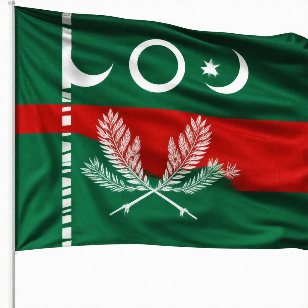 green field with a vertical red stripe near the hoist side containing five carpet guls stacked above two crossed olive branches, with a white crescent and five white five-pointed stars in the upper fly corner |