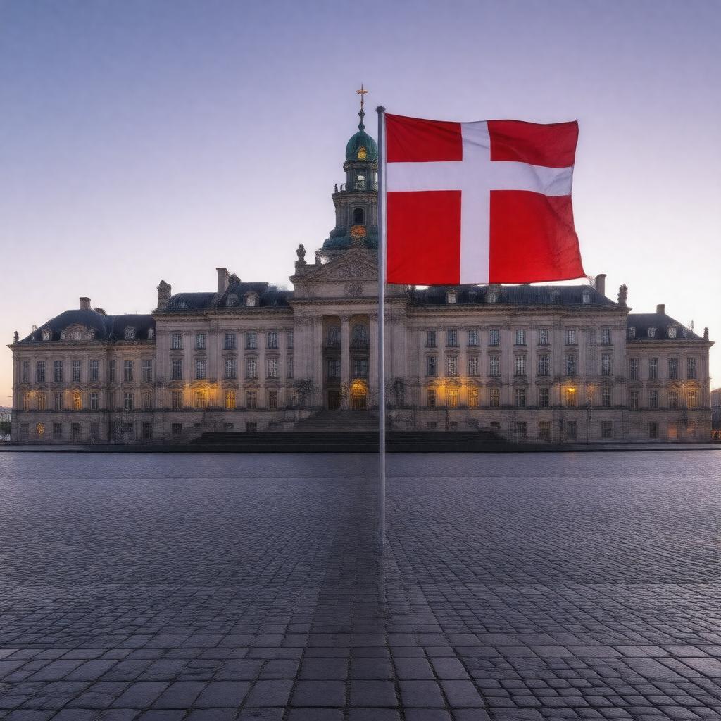 "Generate an image of the exterior of Christiansborg Palace in Copenhagen, Denmark, with a subtle Danish flag waving in the foreground, representing the Folketing, the unicameral legislature of Denmark, at dusk with a calm atmosphere."