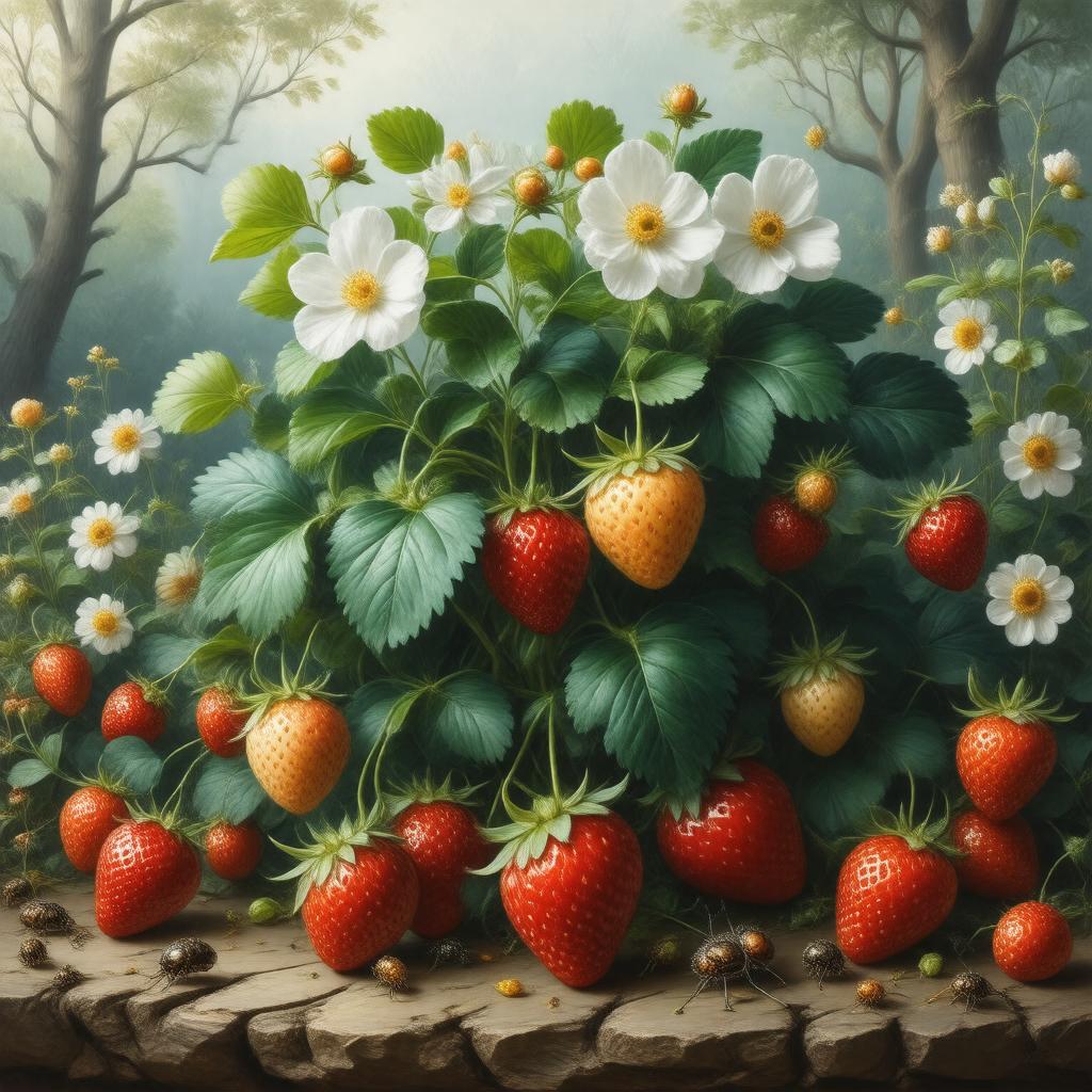 "Generate an image of a lush, vibrant strawberry plant (Fragaria × ananassa) in a garden setting, showcasing its trifoliate leaves, white flowers, and ripe red, yellow, and white fruits, surrounded by a few aphids and a slug, with a subtle background of woodlands and meadows, in a realistic and detailed style."
