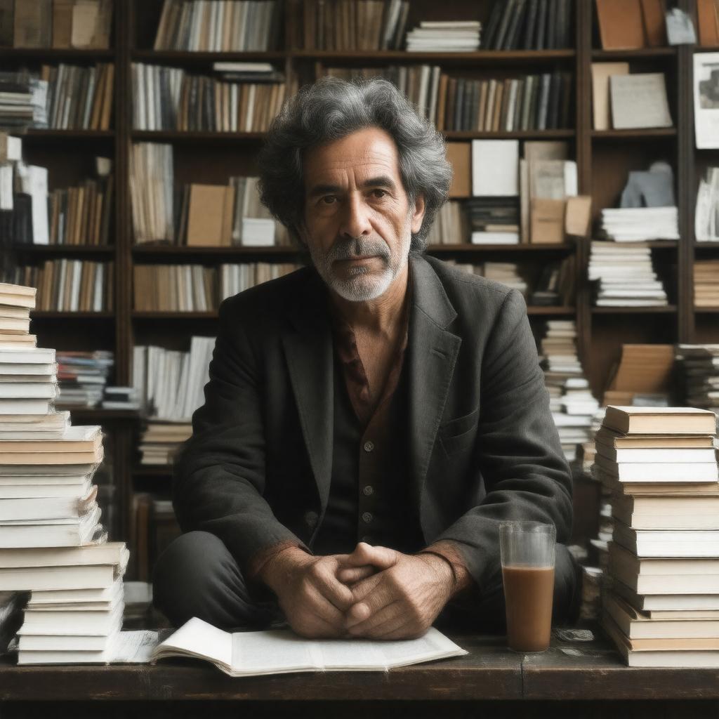 Create an image of Francisco Varela, a Chilean biologist, neuroscientist, and philosopher, sitting in a contemplative pose, surrounded by books and papers related to his work on autopoiesis, enactivism, and neurophenomenology, with a serene and introspective expression, wearing casual yet elegant attire, in a style that blends traditional and digital media, with a muted color palette and soft lighting, reminiscent of a Parisian café, where he spent much of his life.