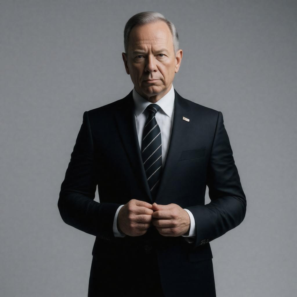 "Generate a realistic image of Frank Underwood, a male American politician, in a powerful pose, dressed in a formal suit, with a calculating gaze, representing his cunning and manipulative personality as the President of the United States, in a style reminiscent of a dramatic TV series."