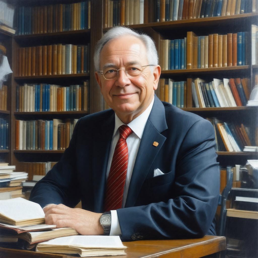 "Portrait of Frank Wilczek, a middle-aged man with a gentle smile, wearing a suit and tie, sitting in a library or office with books and papers around him, with a thoughtful expression, realistic style, Photorealism."