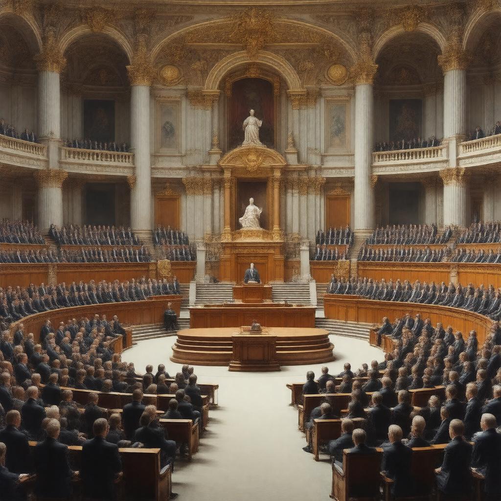 "Generate an image of the interior of the Palais Bourbon, the seat of the French National Assembly, with its iconic hemicycle and presidential chair, surrounded by députés, with a subtle emphasis on the symbol of the Assembly, Marianne, and with a sense of solemnity and legislative activity, in a realistic and detailed style."