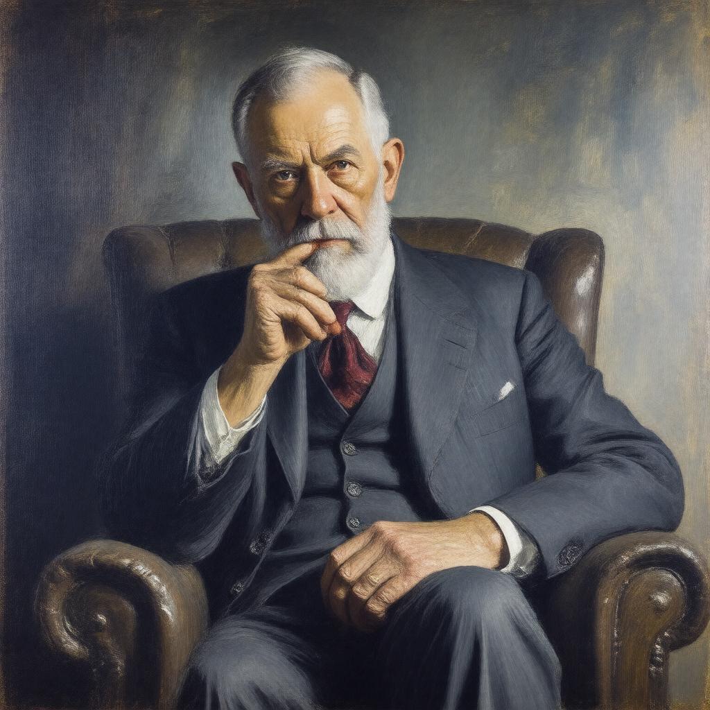 "Portrait of Sigmund Freud, a middle-aged Austrian neuroscientist and psychologist, sitting in a armchair with a contemplative expression, wearing a suit and holding a cigar, in the style of a realistic oil painting from the early 20th century."