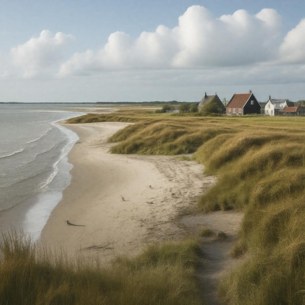 "Generate an image of a scenic view of the Frisian Islands, showcasing a combination of natural features such as beaches, mudflats, and grassy areas, with a few traditional Frisian houses and churches in the background, surrounded by migratory birds and possibly a seal or two, under a temperate maritime sky with a few clouds, highlighting the unique ecosystem and natural beauty of the islands, which are a UNESCO World Heritage Site and a popular destination for nature tourism, cycling, and birdwatching."