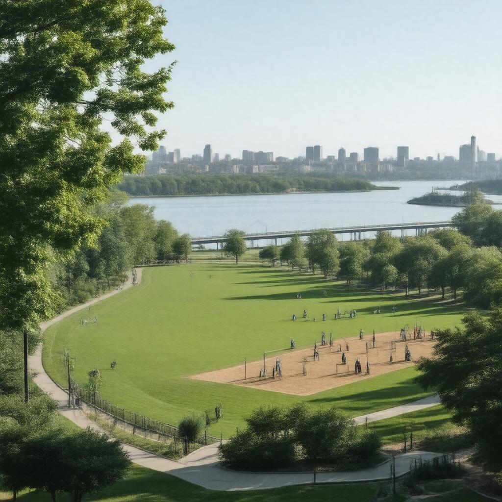 "Generate a realistic image of a scenic 32-acre public park located in Buffalo, New York, designed by Frederick Law Olmsted, featuring athletic fields, a playground, and walking paths along the Niagara River, with the Peace Bridge visible in the background, in a style suitable for a serene urban park in the United States."