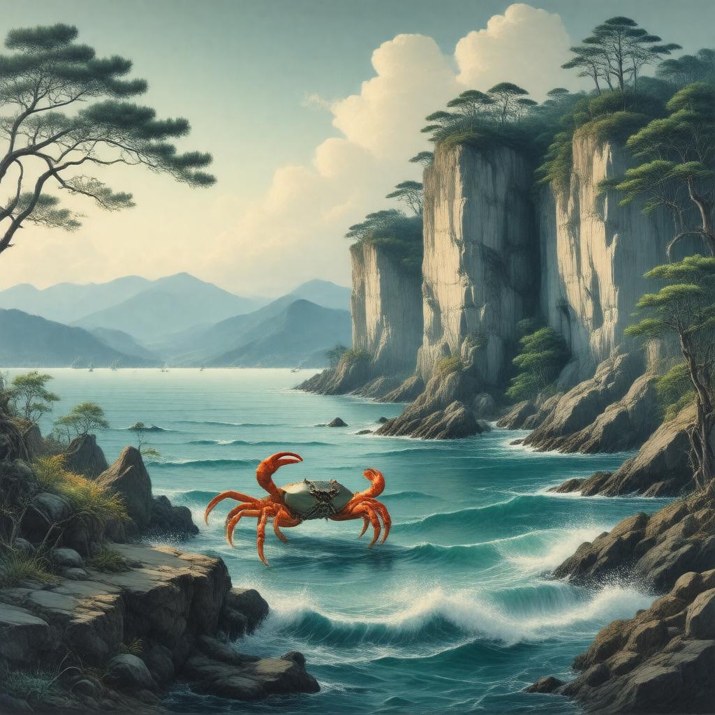 "Generate an image of a scenic landscape representing Fukui Prefecture, featuring the Tojinbo Cliffs and Echizen crab, with a backdrop of the Sea of Japan and a subtle hint of the surrounding mountains, in a style that reflects the region's natural beauty and cultural heritage."