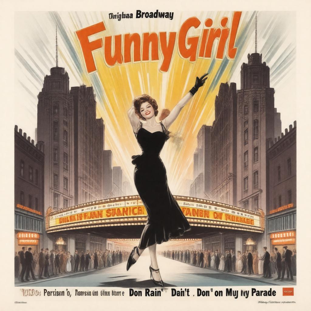 "Generate an image of a vibrant 1960s-style musical poster for the original Broadway production of Funny Girl, featuring Barbra Streisand as Fanny Brice, with a glamorous and colorful design, set against the iconic backdrop of the Winter Garden Theatre, incorporating elements that evoke the classic songs 'Person' and 'Don't Rain on My Parade', in a style reminiscent of vintage playbills and musical theater advertisements."
