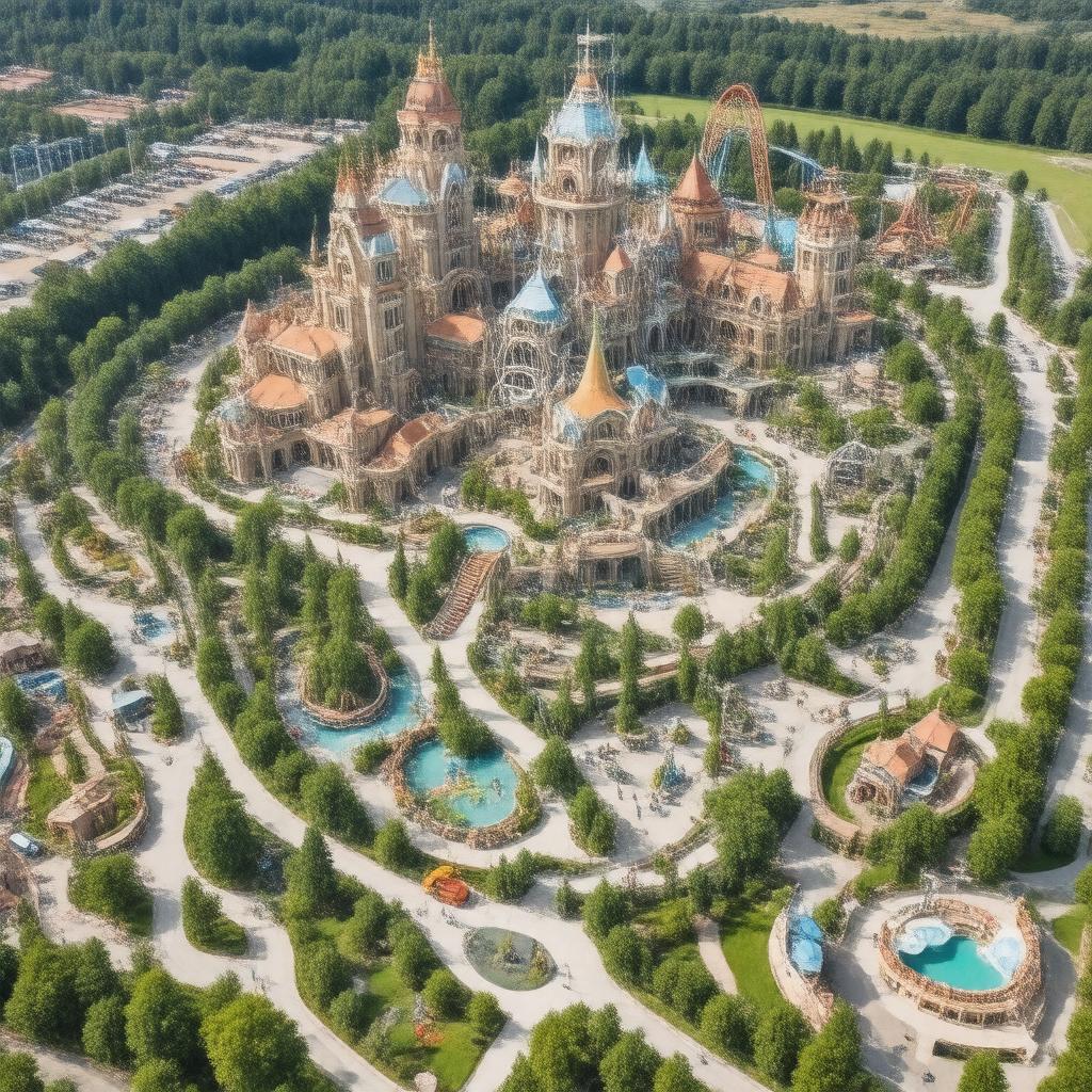 "An aerial view of Gardaland, a large fantasy-themed amusement park located in Castelnuovo del Garda, Italy, near Lake Garda, with various rides, attractions, and themed areas such as Fantasy Kingdom, Adventureland, and Pirates Cove, surrounded by lush greenery and water features, in a colorful and vibrant style."