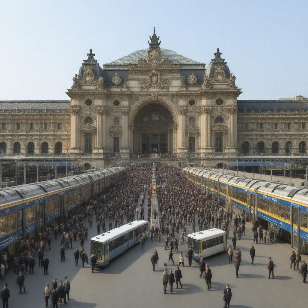 "Generate a realistic image of Gare de Lyon, a large railway station in Paris, France, with its distinctive Beaux-Arts building and bustling platforms, capturing its grandeur and busy atmosphere, incorporating Le Train Bleu restaurant and trains of various services such as TGV, TER, RER, Transilien, and Intercités, set in a daytime scene with natural lighting."