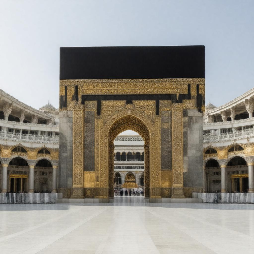 "Generate an image of the Gate of Remission (باب التوبة), a significant gate at Al-Masjid al-Haram in Mecca, Saudi Arabia, depicting its architectural details in a realistic style, with the Kaaba visible in the background, conveying its importance in Islam."