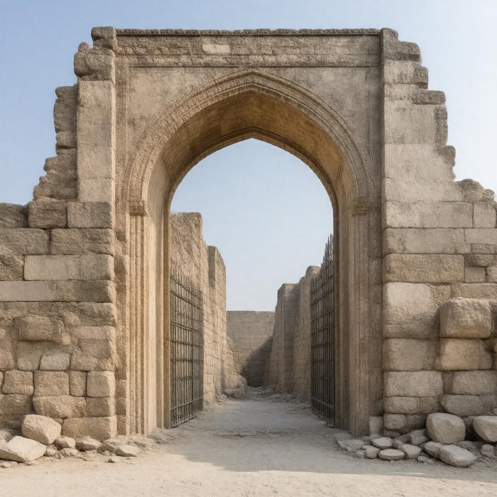 "Generate an image of a ruined stone monument gate, specifically the Gate of the Iron, also known as Darvazeh-ye Asparan, located in Isfahan, Iran, showcasing its historical Safavid era architecture, in a realistic style."