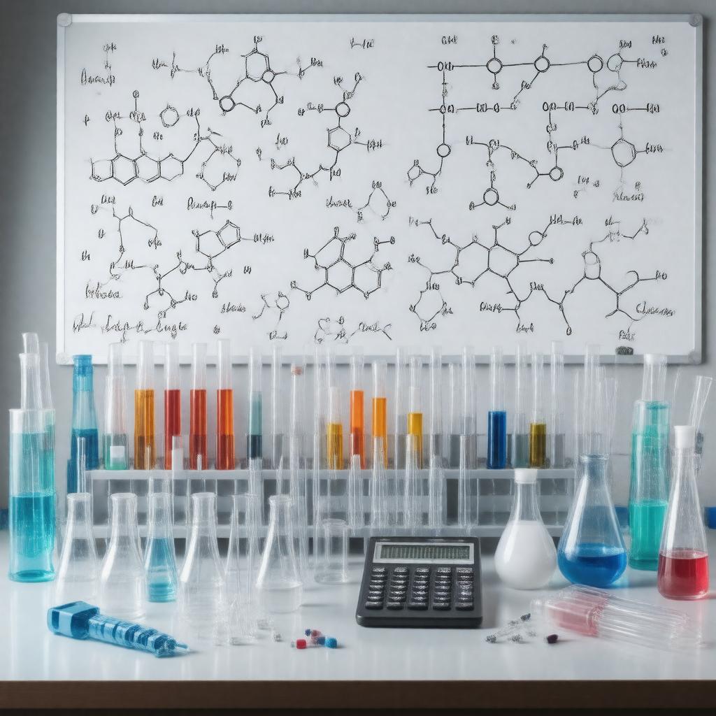 "Generate an image of a chemistry laboratory setting with various equipment and tools, including molecular model kits, glassware, and a calculator, with a whiteboard in the background displaying chemical equations and formulas, representing General Chemistry, a fundamental academic field of study in chemistry."