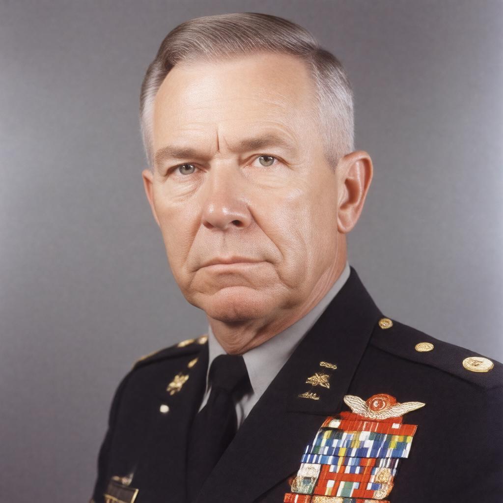Create a realistic portrait image of General Leslie Groves, a middle-aged man with a stern expression, wearing a United States Army uniform with the rank of Lieutenant General, in a formal setting, possibly with a background that hints at his involvement in the Manhattan Project or the construction of The Pentagon.
