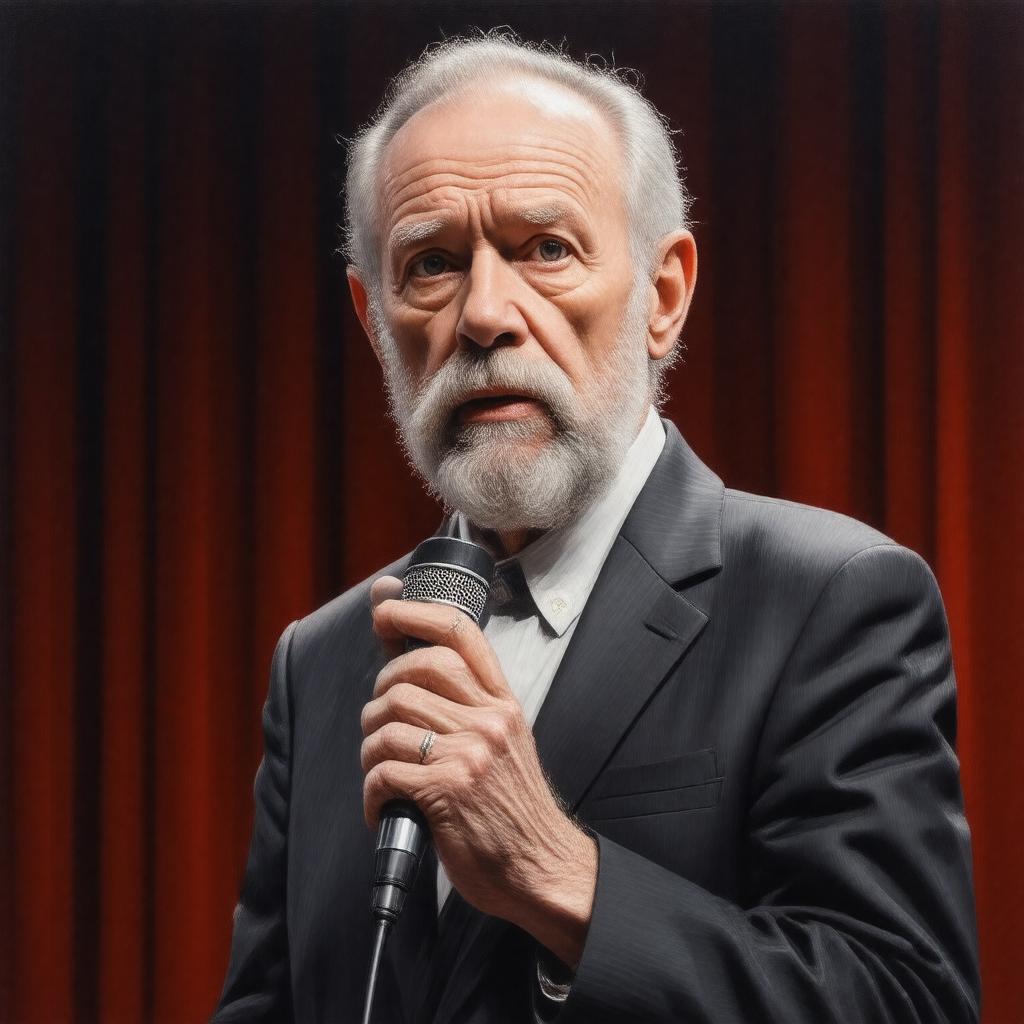 Create an image of George Carlin, a renowned American comedian, actor, author, and social critic, captured in a realistic and satirical style, possibly incorporating elements of observational comedy, black comedy, and surreal humor, standing on a stage with a microphone, wearing his signature attire, with a stern yet thought-provoking expression, reflecting his influence on comedy and social commentary.