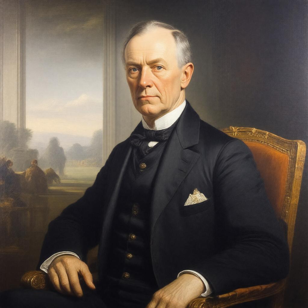 "Generate a realistic portrait of George Nathaniel Curzon, 1st Marquess Curzon of Kedleston, a British politician, diplomat, and writer, dressed in formal attire, sitting in a dignified pose, with a background that reflects his association with Kedleston Hall and his roles in British politics, in the style of a high-quality Victorian-era oil painting."