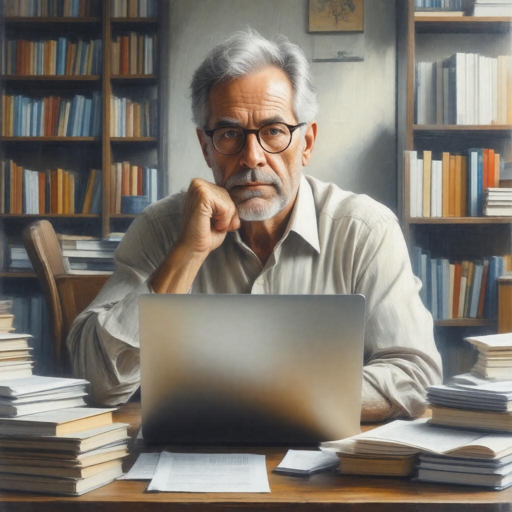 Generate an image of a middle-aged American man with a thoughtful expression, sitting at a desk with a laptop and papers, surrounded by books and a few notes, representing George Packer, a renowned American writer, journalist, and playwright, in a realistic style.