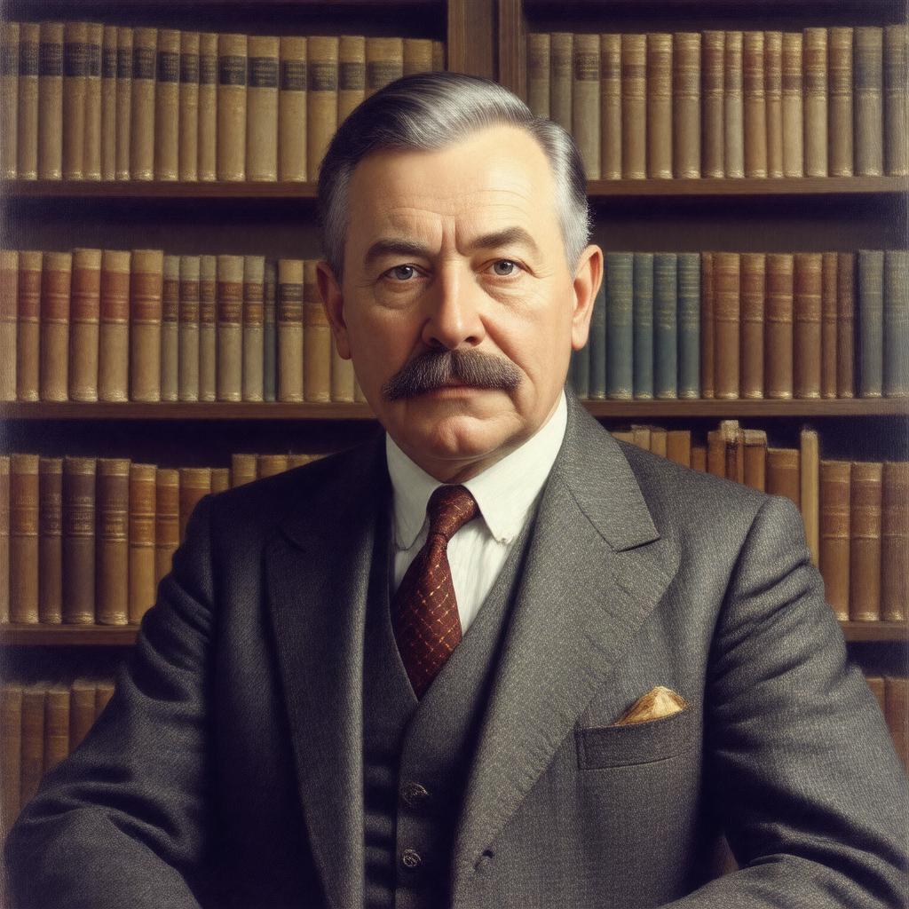 Generate a realistic portrait of George Philip Wells, a middle-aged British biologist and author, with a gentle expression, wearing a suit and tie, sitting in a library or study surrounded by books, with a subtle background hinting at his connection to his famous father H.G. Wells, in a style reminiscent of 20th-century British portraiture.