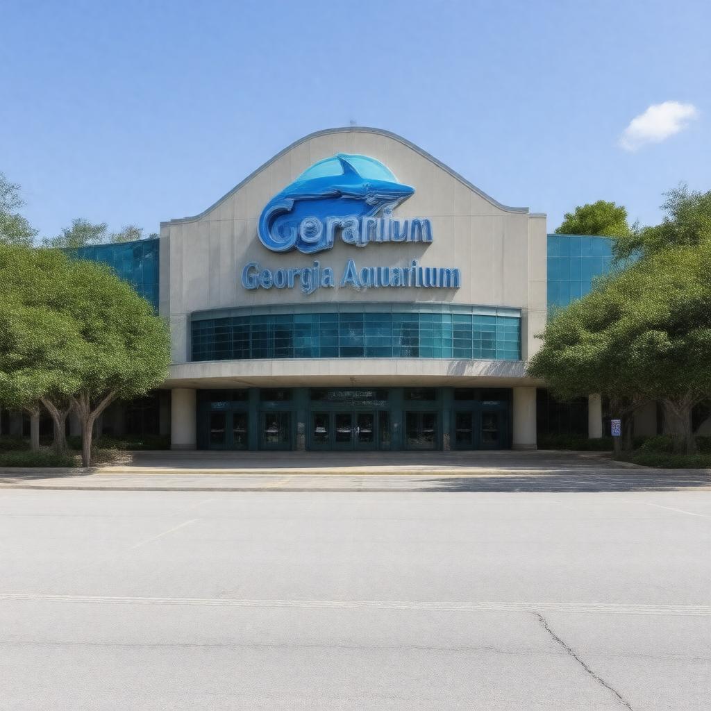 "Generate an image of the exterior of Georgia Aquarium, a large aquarium located in Atlanta, Georgia, United States, at 225 Baker Street NW, Atlanta, GA 30313, featuring its distinctive architecture and a large sign with its name, in a daytime setting with a clear blue sky, in a realistic style."