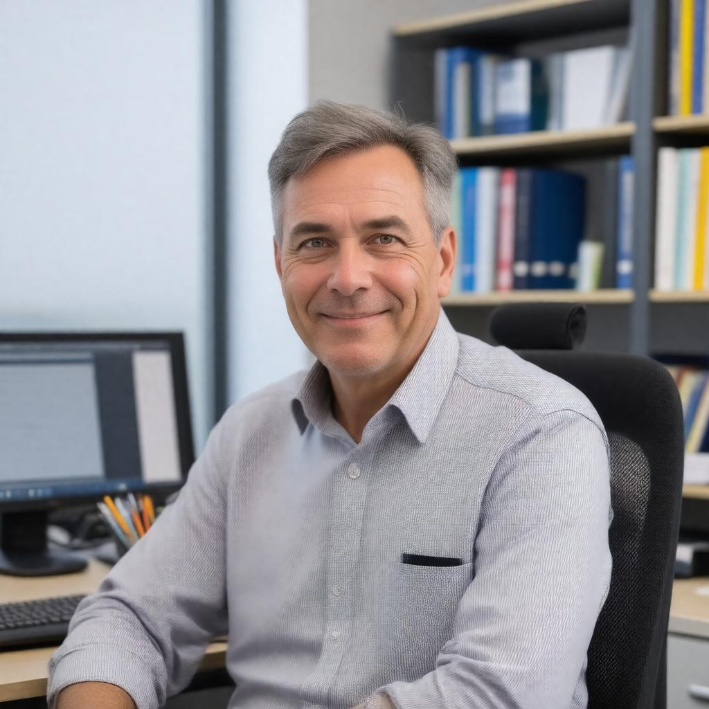 Generate a realistic image of a middle-aged American man with a warm and approachable expression, sitting in a professorial setting, surrounded by computer equipment and academic materials. He has a slight smile and is looking directly at the viewer. He is dressed in casual yet professional attire, with a few pens and pencils in his pocket protector. In the background, there are shelves filled with computer science textbooks, and a large window with a view of the MIT campus. The overall style should be a realistic portrait, capturing the essence of a renowned computer scientist and professor. The image should convey a sense of warmth, intelligence, and authority.