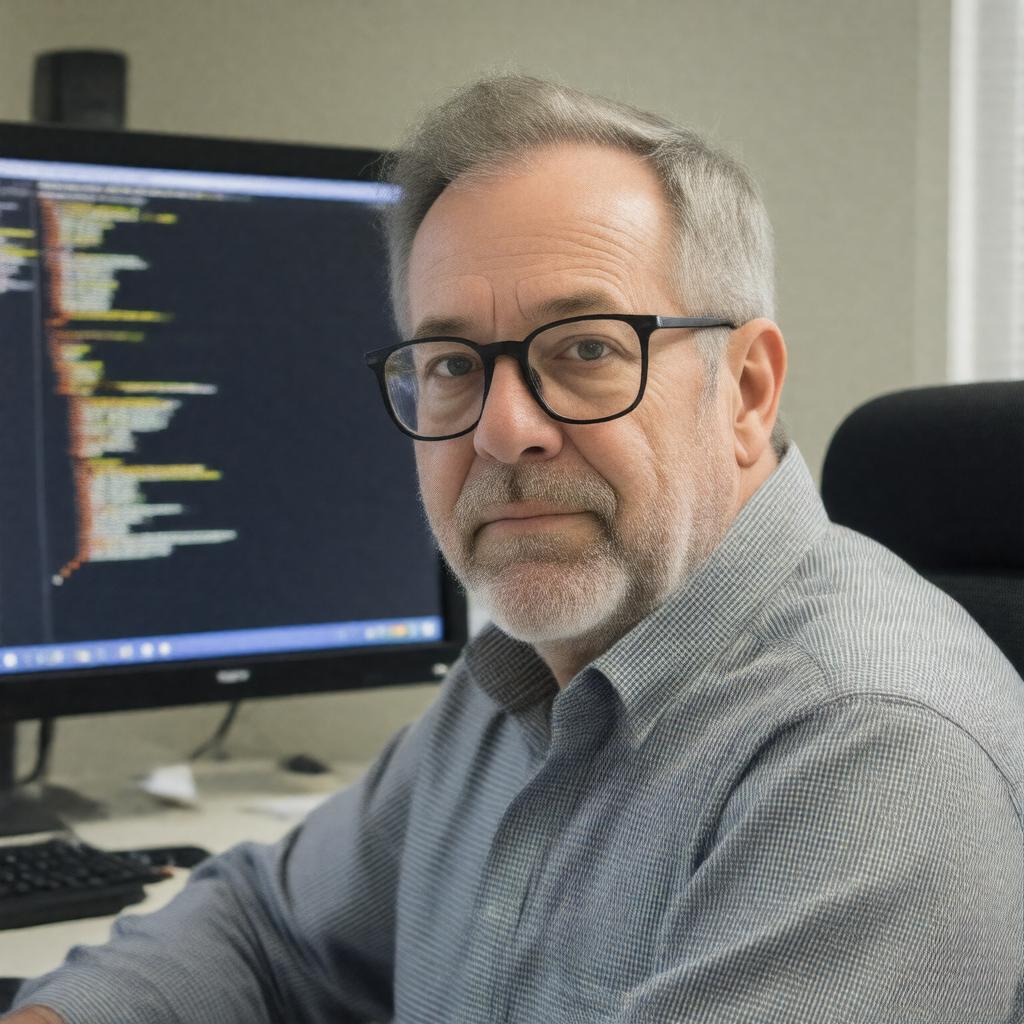 Generate a realistic image of Gerald Sussman, a middle-aged American computer scientist and professor, sitting in front of a computer screen displaying code in the Scheme programming language, with a thoughtful expression, wearing a pair of glasses and a casual button-down shirt, in a style reminiscent of a professional headshot or an academic portrait.