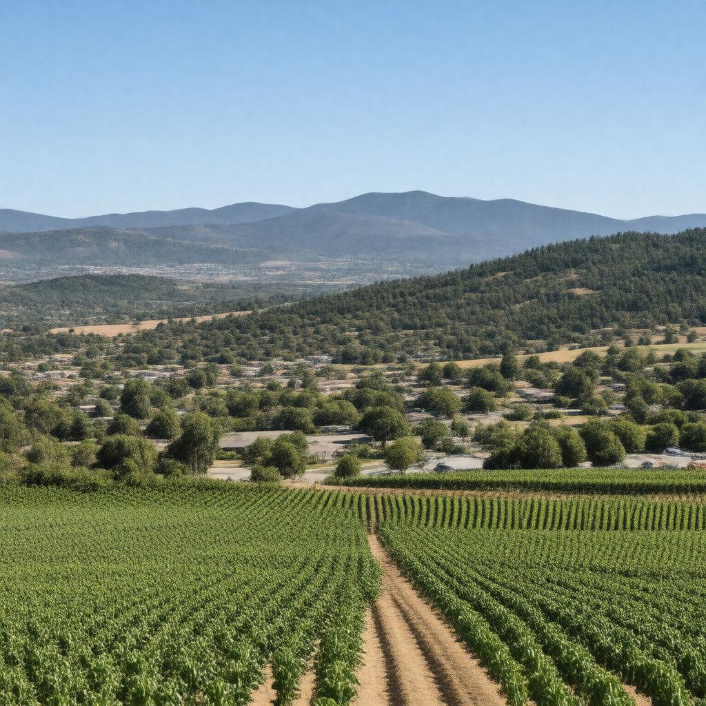 "Generate a realistic image of Gilroy, a city in Santa Clara County, California, known as the Garlic Capital of the World, showcasing its scenic landscape, possibly with a garlic farm or festival in the foreground, surrounded by rolling hills and sunny California weather, in a daytime setting with a clear blue sky."