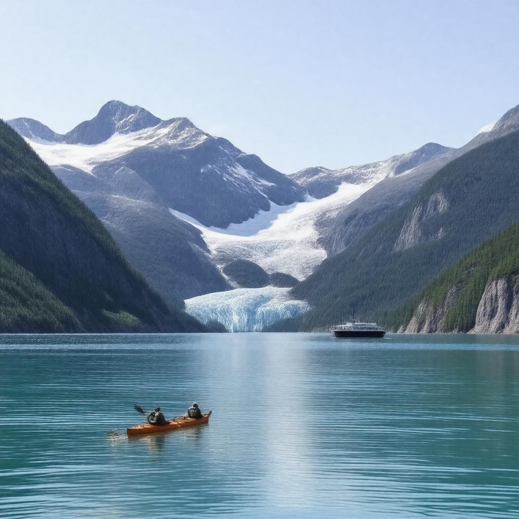 "Generate a serene and majestic image of Glacier Bay National Park, showcasing its vast expanse of glaciers, fjords, and mountains. Depict a glacier-filled bay with crystal-clear waters, surrounded by towering mountains and lush greenery. Include a few kayakers or a small cruise ship in the distance to give a sense of scale and human presence. The style should be photorealistic, with soft lighting and vibrant colors to capture the natural beauty of this UNESCO World Heritage Site. Include notable features such as Margerie Glacier, Johns Hopkins Glacier, and Mount Fairweather in the background."