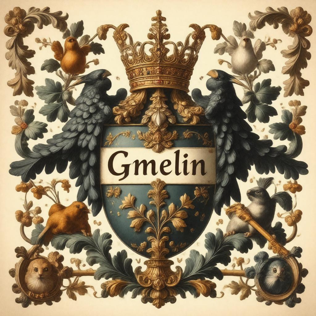 Create an image of a realistic 18th-century European-style family coat of arms, featuring the surname "Gmelin" in a elegant, cursive font, surrounded by symbolic elements such as leaves, flowers, or animals, set against a neutral, muted background, in a detailed and colorful illustration style.