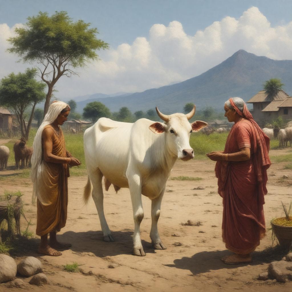 Generate an image of a rural Indian village scene with a cow in the center, surrounded by a poor farmer, his wife, and barren landscape, depicting the themes of poverty, social injustice, and rural life, in a realistic style, representing the novel "Godaan" or "The Gift of a Cow" by Munshi Premchand.