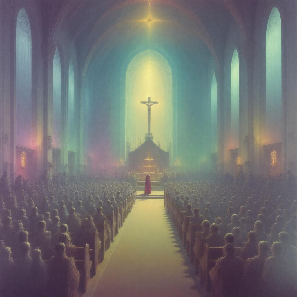 "Create an image of a serene and contemplative scene depicting a Good Friday service at Marsh Chapel, Boston, on April 20, 1962, with subtle hints of psychedelic influence, incorporating elements that evoke a sense of mystical experience, while maintaining a realistic representation of the chapel and its attendees, with a muted color palette and soft lighting, symbolizing the profound spiritual experiences reported by the participants in the Good Friday Experiment."