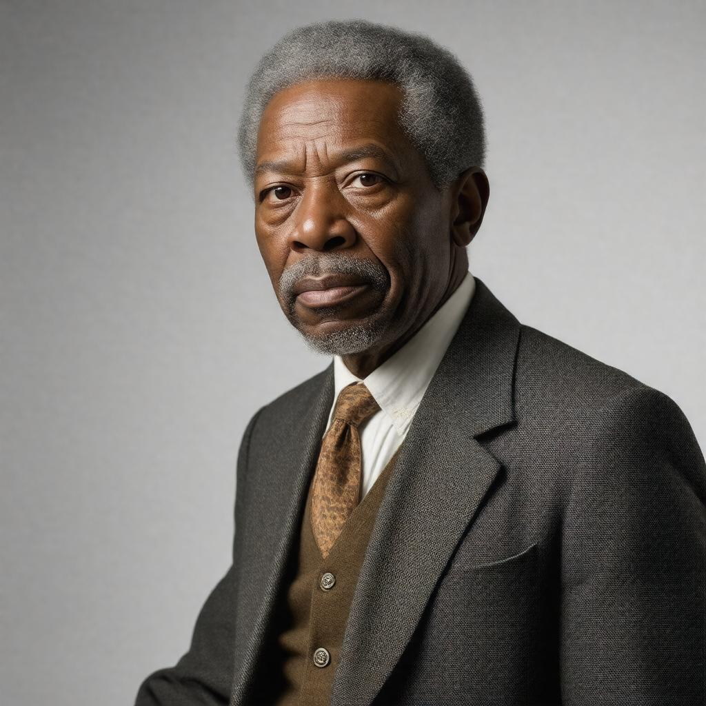 Create a realistic portrait image of Gordon Parks, a renowned African-American photographer, film director, writer, and musician, in a documentary photography style, capturing his essence as a prominent figure in American art and culture, with a neutral background that highlights his personality, wearing attire reflective of his era, possibly with some of his notable works or photography equipment nearby, embodying his legacy and contributions to photojournalism, portrait photography, and the civil rights movement.