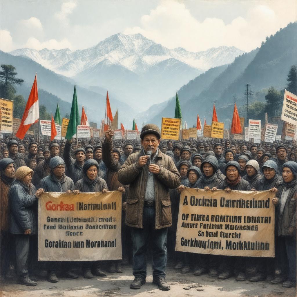 "Generate an image of a protest scene in the Darjeeling hills, with a large crowd of people holding placards and banners, and a backdrop of the Himalayan mountains. The protesters should be predominantly of Gorkha descent, with some holding flags of the Gorkha National Liberation Front and Gorkha Janmukti Morcha. In the foreground, a leader should be visible, possibly Subhash Ghisingh or Bimal Gurung, addressing the crowd through a microphone. The atmosphere should be one of determination and urgency, with a sense of longing for a separate Gorkhaland state. The image should be in a realistic style, with muted colors and a focus on conveying the emotions and demands of the protesters."