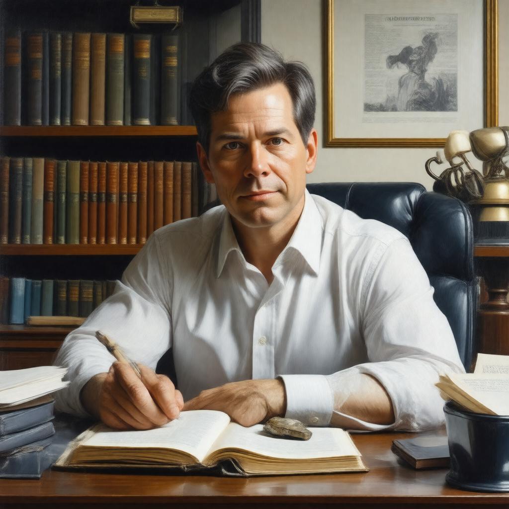 Create a realistic portrait of Graham Moore, a middle-aged American screenwriter, novelist, and author, sitting in a study with a subtle background that hints at his literary and cinematic achievements, such as a bookshelf with some of his notable works, "The Imitation Game", "The Sherlockian", and "The Last Days of Night", and a film script or award certificates on his desk; he should be dressed in attire that reflects his professional yet approachable personality, with a thoughtful expression that captures his creative essence.