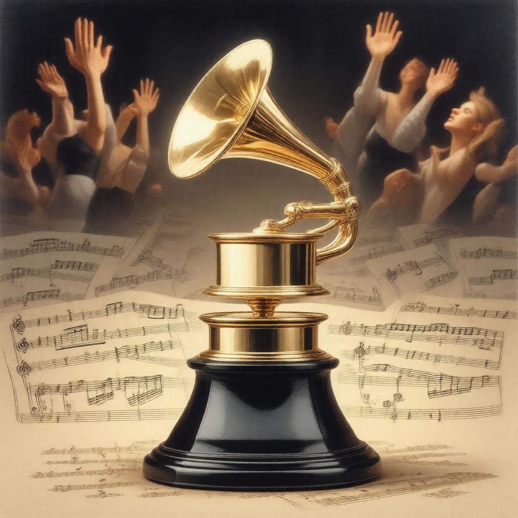 "Create an image of a prestigious award trophy, symbolizing the Grammy Legend Award, which is a special merit award presented by The Recording Academy to recognize ongoing contributions and influence in the music industry, amidst a backdrop of musical notes or a concert scene, in a realistic and elegant style."