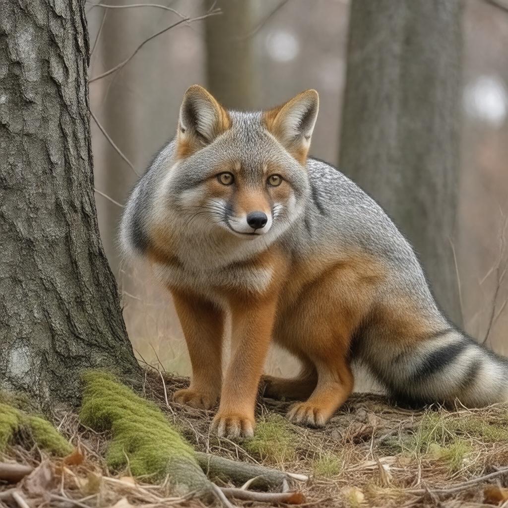 "Generate an image of a gray fox (Urocyon cinereoargenteus) in a woodland habitat, showcasing its grizzled gray fur with reddish sides, white throat, and black stripe on its tail, highlighting its ability to climb trees, which is a distinctive feature of this species, the only American canid with this capability."