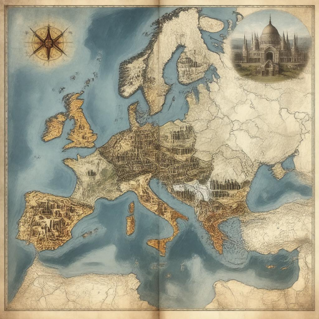 "Generate an image of a split map of Europe and Asia, with the Eastern Orthodox Church symbol on one side and the Roman Catholic Church symbol on the other, depicting the division caused by the Great Schism in 1054, with faded images of the Hagia Sophia and St. Peter's Basilica in the background, representing the theological and ecclesiastical differences that led to the separation of Eastern and Western Christianity."