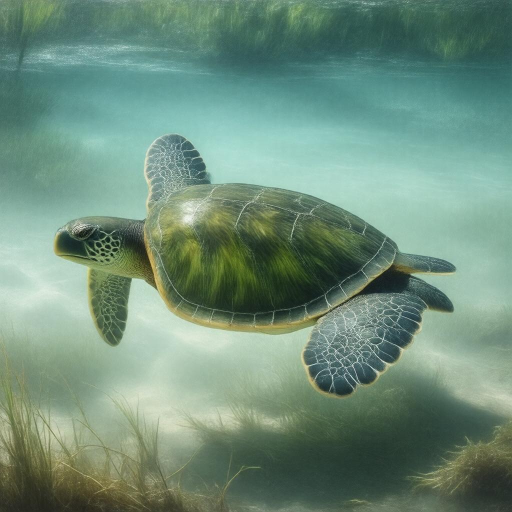 "A large, olive to dark green green sea turtle (Chelonia mydas) swimming in shallow tropical waters, surrounded by seagrasses and algae, with a smooth carapace and a single pair of prefrontal scales, looking upwards with its flippers outstretched, in a photorealistic style."