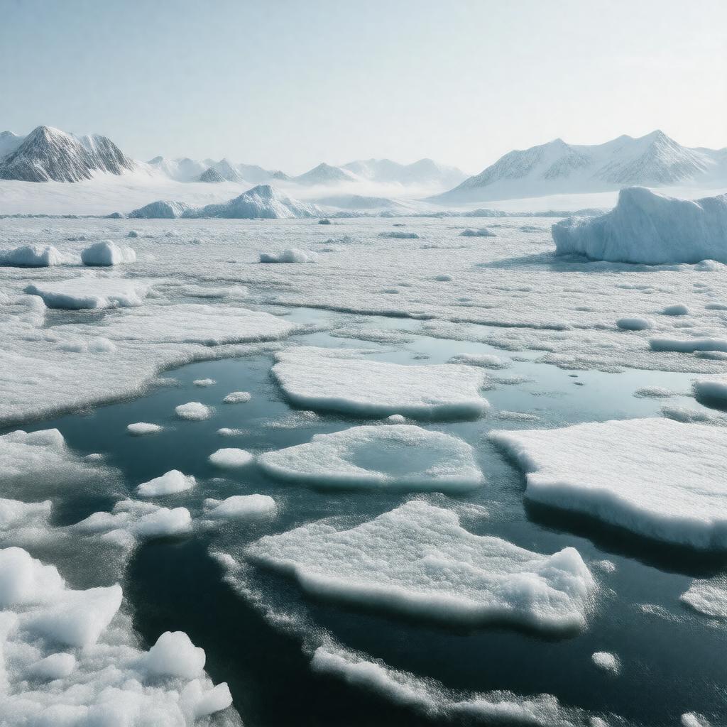 "Generate an image of a vast, icy marine landscape, depicting the Greenland Sea in the Arctic Ocean. The scene should feature a mix of open water and floating icebergs, with a few snow-capped mountains in the background. Include a variety of marine life such as birds, cod, haddock, and halibut in the water. The style should be realistic and convey the harsh, polar climate of the region. Incorporate subtle hints of ocean currents, such as gentle waves or swirling patterns in the water. In the distance, a few islands like Jan Mayen, Bear Island, or Hopen can be seen, with Svalbard and Greenland visible on the horizon."
