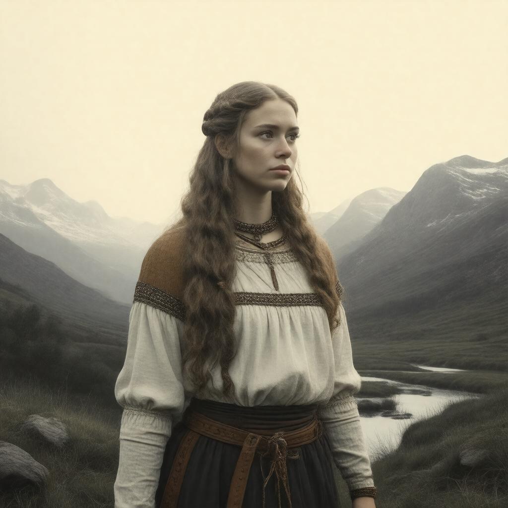 "Generate an image of Gudrun, the female mythological figure from Norse mythology, in a realistic style inspired by medieval Icelandic illustrations, standing heroically with a subtle Nordic landscape in the background, reflecting her connection to the Poetic Edda and Völsunga saga, with a solemn expression, dressed in traditional Germanic attire, embodying her strength and resilience as depicted in the legends."